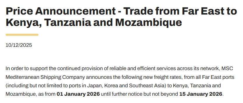 日前,全球第一大班轮公司地中海航运(MSC)发布了2026年远东-非洲三国运价公告。公告宣布自2026年1月1日起(直至另行通知,但不超过2026年1月15日)