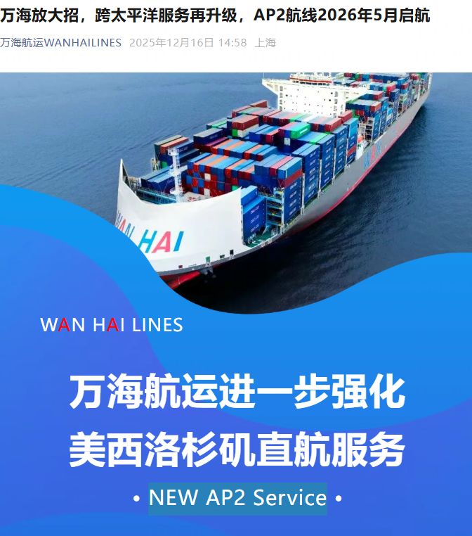 12月16日(今天),万海宣布进一步强化美西洛杉矶直航服务,将与ONE共同于2026年5月推出第二条洛杉矶直达航线——AP2(NEWAP