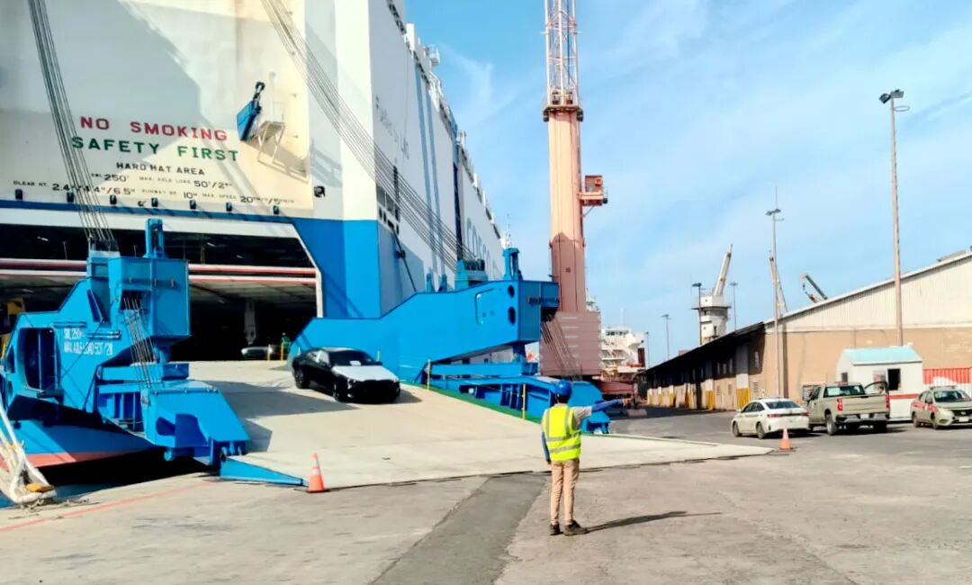 当地时间12月12日,红海中远海运系多用途码头现场,一辆辆来自欧洲的工程机械、商品车从“文景口”轮缓缓卸至堆场,标志着远海汽车船&ldq