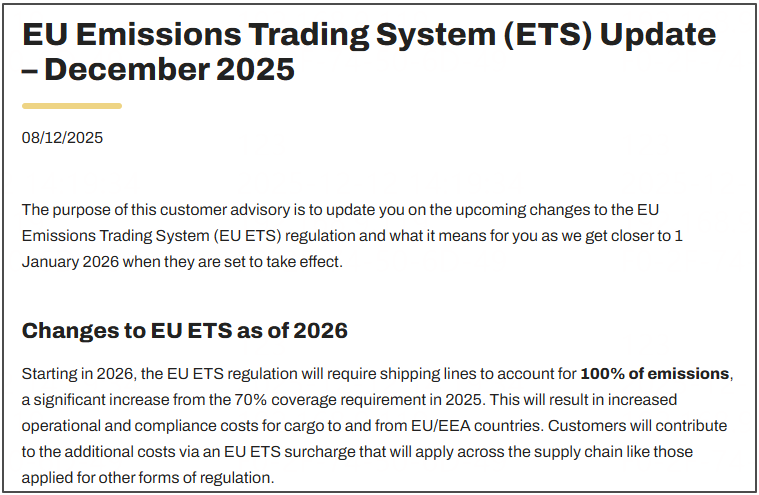 2024年初,欧盟ETS扩展至航运业,2026年将实现100%覆盖。本周,MSC发布公告称,自2026年起,欧盟碳排放交易体系法规将要求航运公司承担100%的排