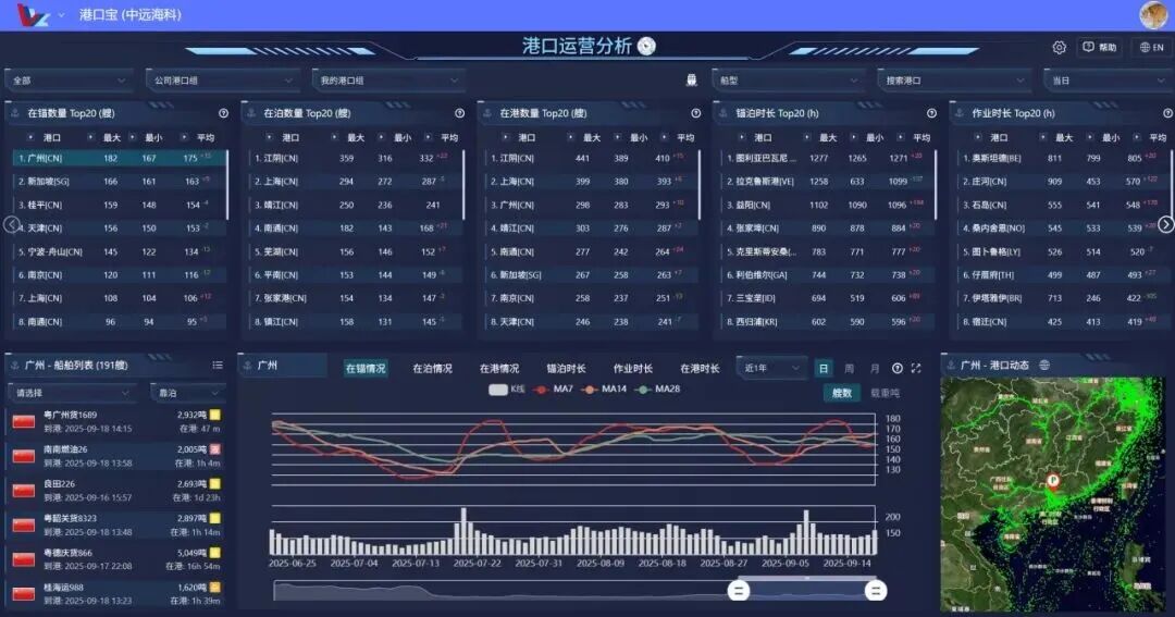 1、支持查看或制定港口组的在锚/在泊/在港数量、锚泊/作业/在港/平均等泊/平均作业/平均停留时长等数据看板。