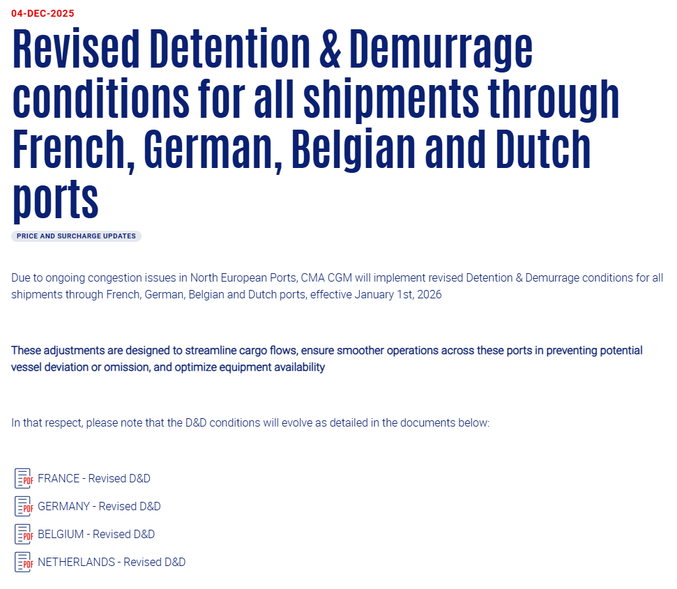 鉴于北欧港口持续存在的拥堵问题,法国达飞海运集团(CMACGM)于近日宣布,自2026年1月1日起,将对经由法国、德国、比利时及荷兰港口的所有货运业务执行滞期费