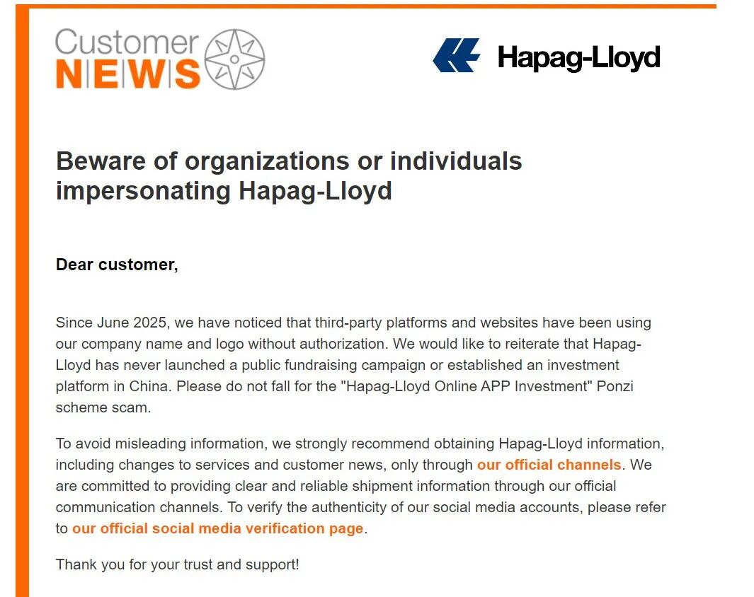 德国班轮运营商赫伯罗特(Hapag-Lloyd)周一(12月8日)发布了一则声明,引起市场关注。声明揭露,自2025年6月起,有不明第三方平台及网站冒用&ldq