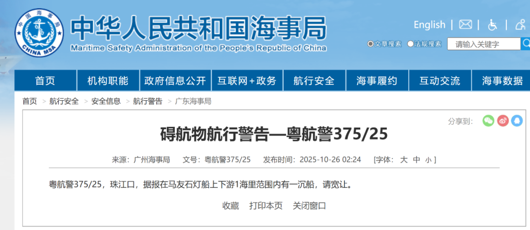 10月26日16时54分,广州海事局发布《关于“10·25”珠江口船舶碰撞事故的情况通报》,2025年10月25日,广州市海上搜救中心接报,19时55分许,一艘散货船在由广州开往上海的过程中,在伶仃航道马友石灯船附近水域与一艘进港集装箱船发生碰撞后沉没。