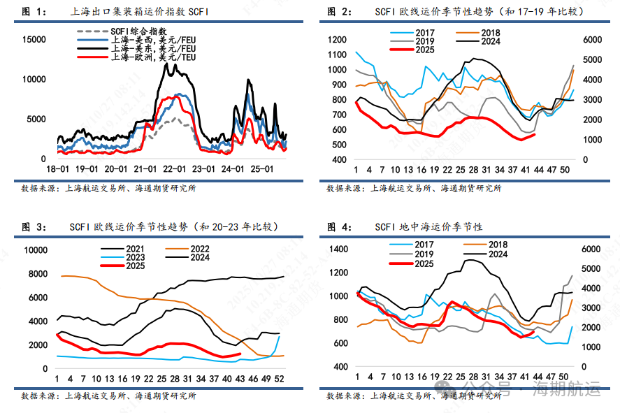 需求端,节后订舱需求持续改善,尤其是部分海外进口商安排其圣诞新年休假前的进口运输,部分圣诞节前抵达欧洲的航次订舱火爆,节内的则装载偏弱。后续观察11月货量表现,根据历史数据,11月亚洲出口到欧洲(包括地中海)的集装箱贸易量在过去5年平均同比减少1%,11月相对偏弱的季节表现主要在于前述提到的到港时间船期问题,尤其是上旬订舱需求平淡。