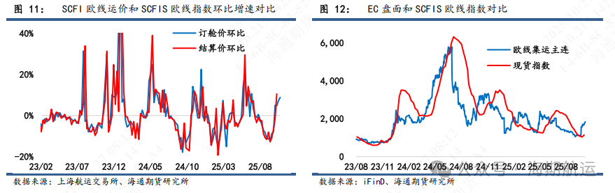 从合约交易逻辑来看,12合约更多博弈旺季挺价成色,主要关注实际基本面供需结构的变化,后续进一步高度的抬升将跟随现货情况波动。参考目前加沙停火协议执行进度和预期的船司复航节奏,预计12月受影响的可能性有限。2602合约属性相对复杂,具有部分旺季成色但同时受到潜在复航情绪扰动,强现实驱动下会跟随近月但同时也较易受到地缘事件波动影响;更远的2604及以后的合约一方面在26年供需结构进一步弱化的背景下中枢将较25年下移,同时也承担较大的复航预期,存在向23年估值收敛的可能性。