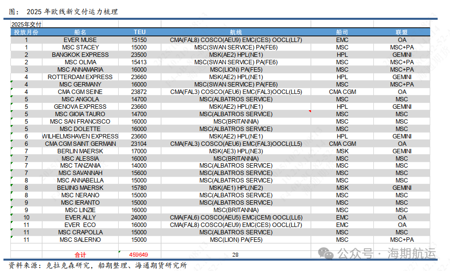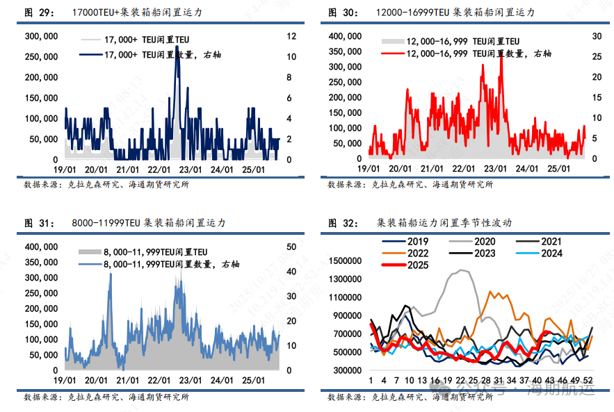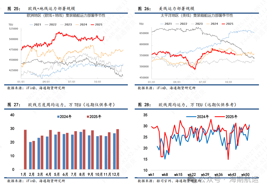 新船交付方面,1-11月华东-欧基预计接收新交付集装箱船28艘,合计运力46wTEU,主要通过替代小船/非环保运力和增补运力带来净增量。继续绕行背景下,25年静态运力部署从429wTEU增加至436wTEU,增加7.3wTEU/1.7%。动态周均运力被动维持32-33wTEU的高负荷水平,淡季考验船司空班意愿,旺季限制运价上行高度。