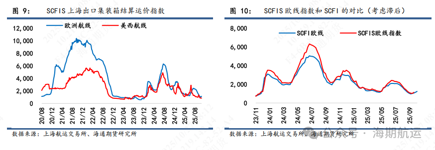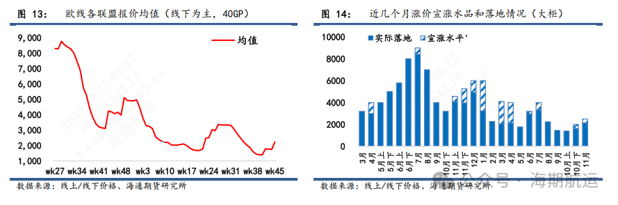 现实端后续关注11月提涨落地成色,船司初期报价分化较大,大柜1900-2600美金不等,10月末船期到达欧洲港口的时间不一导致装载率出现较大分化,滚囤规模累计程度的多少也影响了后续11月初船司报价的态度。目前马士基和OA联盟报价相对偏高,而PA联盟则存较大揽货压力,报价相对激进。11月从货量角度并无太多支撑,但运力结构经过几轮主动空班和11月末回程船延误后的被动空班调整后整体表现偏紧,涨价落地成色取决于更微观的供给变化,运价有望维持在大柜2000-2200美金左右的均值水平,成为后续12月份进一步提涨的支撑。