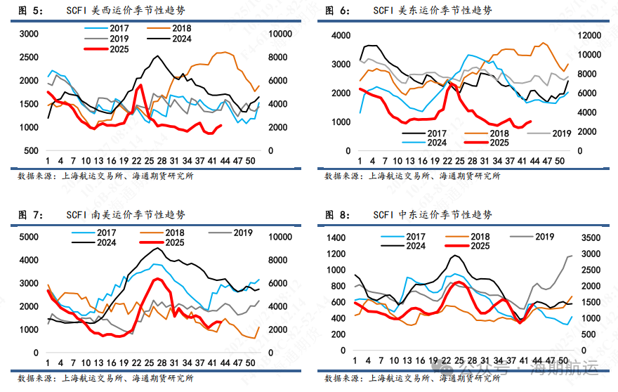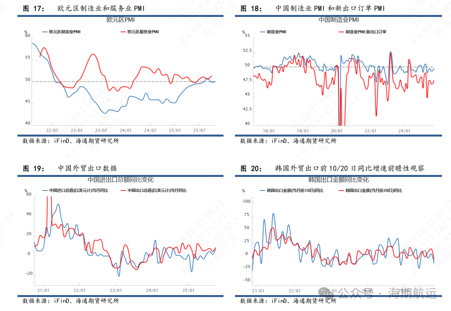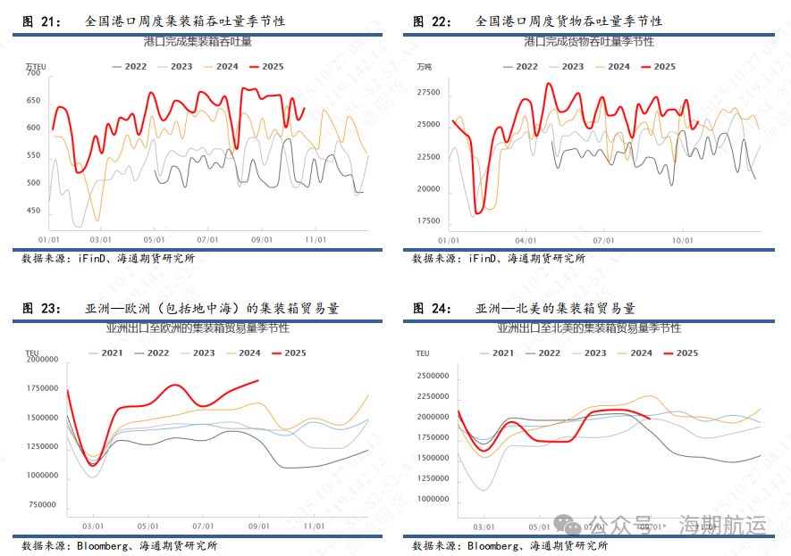 中国出口活动呈现常态季节性波动:参考中国交通部的港口完成集装箱运输量,10月13日至10月19日监测港口累计完成集装箱吞吐量643.1万标箱,环比上行3.61%,同比增加9.1%。欧线方面,节后订舱需求持续改善,尤其是部分海外进口商安排其圣诞新年休假前的进口运输,部分欧洲到港时间在圣诞节前的航次订舱火爆,相比之下圣诞节内到达欧洲港口的航次则订舱情况一般,体现在船司装载率上马士基和OA联盟装载情况较好,而PA相对一般。后续观察11月货量表现,根据历史数据,11月亚洲出口到欧洲(包括地中海)的集装箱贸易量在过去5年平均同比减少1%,11月相对偏弱的季节表现主要在于前述提到的到港时间船期问题,尤其是上旬订舱需求平淡;可能会对11月船司挺价带来挑战,需结合更加微观的周度供给以预期涨价落地成色。