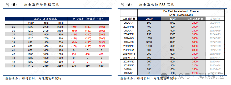 现货运价方面,11月初现货报价均值大柜2250美金。马士基开舱wk45报价大柜2350美金,环比10月底的44周上行550美金。OA联盟报价中,CMA报价大柜2600美金,COSCO和OOCL报价大柜2200-2300美金不等。PA联盟报价基本收敛在大柜2100美金,其中HMM线上特价至大柜1906美金。船司报价区间较宽,大柜1900-2600美金不等,体现出其装载率分化。马士基和OA联盟10月末大面积爆舱支撑其11月初报价维持相对高位,同时PA联盟的10月末订舱相对中性,主要是因其月末船期到达欧洲港口正值圣诞假期,海外客户尽量避免该期间内到港的航次,所以PA联盟在11月初的舱位相对宽松,揽货存一定压力。部分10月末船期延误,后期华南和华东港口可能存在沿用华北10月末报价的情况出现,后续持续关注。除现货价格外,需要注意的是市场目前主流揽货价格约在大柜2000美金,包括马士基指数约,MSC的NAC合约和配比价格,PA的集量特价等,前两者不计入指数。后续关注11月上旬揽货效果以及参考去年的节奏船司是否存在下旬继续推涨的可能性。