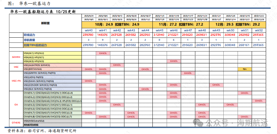 华东—欧基11月周均运力下修至27.2wTEU,其中wk46运力规模偏低,共计6个停航,包括GEMINI联盟的AE3,PA联盟的FE3,以及OA联盟的FAL1/AEU3/AEU7/CES航次。目前11月上旬周均运力26.2wTEU,相对健康。11月末同样停航较多,包括OOCL的LL1,COSCO的AEU7和EMC的CES航次,其中OOCL新增的LL1停航主要是因为COSCO的AEU3航次受到鹿特丹港口拥堵的影响导致返程船期延误,原LL1的OOCL PORTUGAL被部署至AEU3航次的12月初船期上;因此11月最后一周的运力相对偏低,不足27wTEU。目前12月周均运力初步统计为29.5wTEU,远端运力仅供参考,存调整可能。