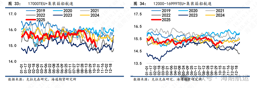 航速:航速处于正常波动范围。17000TEU以上的平均航速降至14.92节,实际欧线船舶航行速度维持在17-18节;12000-16999TEU的平均航速同样降至15.16节。基于该航速数据统计口径,港口拥堵变化程度对平均航速会带来影响;前期欧洲港口拥堵有所缓解,可能是航速小幅回落的原因之一。