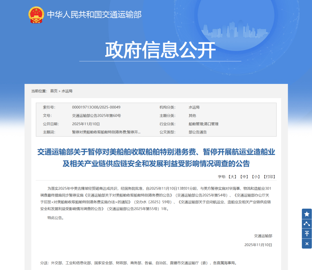 为落实2025年中美吉隆坡经贸磋商达成共识,经国务院批准,自2025年11月10日13时01分起,与美方暂停实施对华海事、物流和造船业301调查最终措施同步暂停实施《交通运输部关于对美船舶收取船舶特别港务费的公告》(交通运输部公告2025年第54号)、《交通运输部办公厅关于印发<对美船舶收取船舶特别港务费实施办法>的通知》(交办水〔2025〕59号)、《交通运输部关于启动航运业、造船业及相关产业链供应链安全和发展利益受影响情况调查的公告》(交通运输部公告2025年第55号)1年。