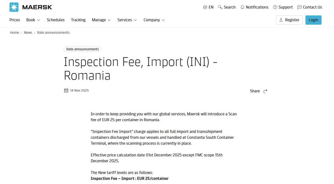 “进口检验费”适用于所有从马士基船舶卸下并在罗马尼亚康斯坦察南集装箱码头处理的整箱进口和转运集装箱,目前该码头已实施扫描流程。