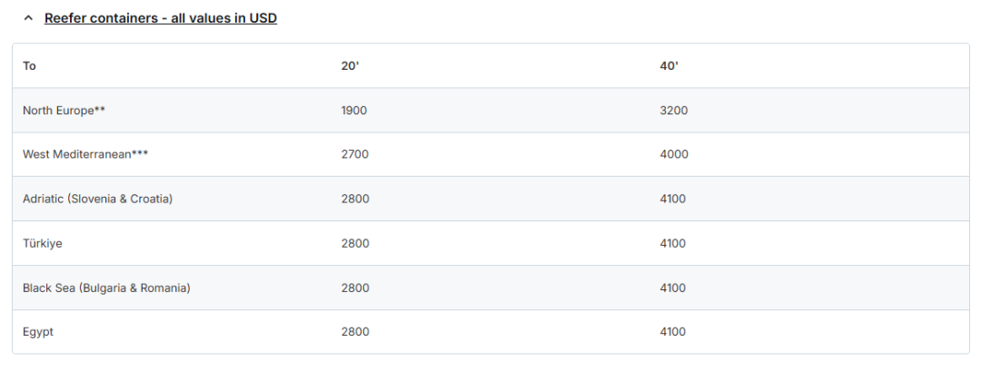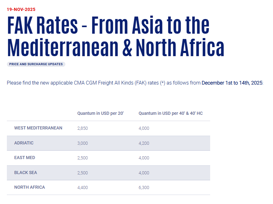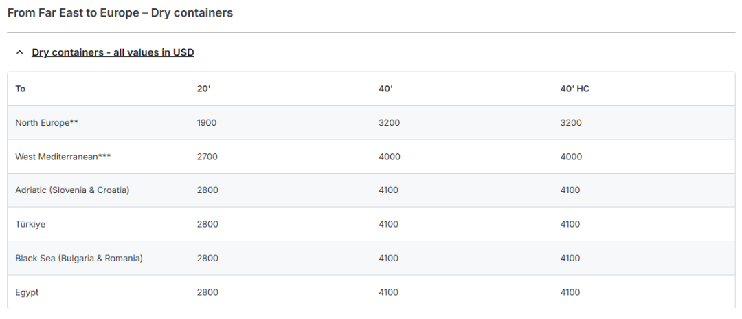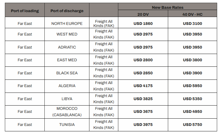 MSC宣布,自2025年12月1日起,从远东港口(包括但不限于日本、韩国和东南亚的港口)至北欧和地中海(包括西地中海、东地中海、亚得里亚海和北非)以及黑海港口的新运费将调整为如下: