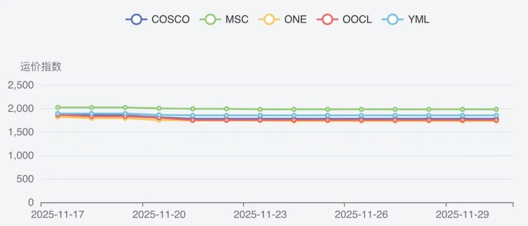 澳新航线市场运价从之前的上涨转为下跌走势。11月21日,上海港出口至澳新基本港市场运价(海运及海运附加费)为1539美元/TEU,较上期下跌11.8%。