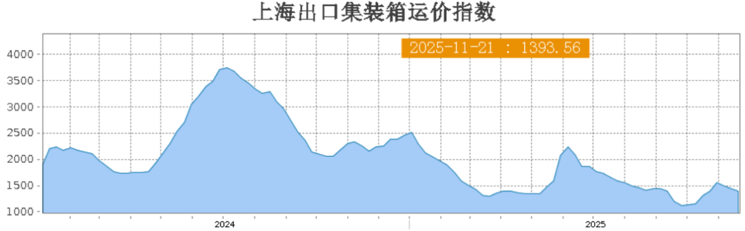 11月21日,上海航运交易所发布的上海出口集装箱综合运价指数为1393.56点,较上期下跌4.0%。