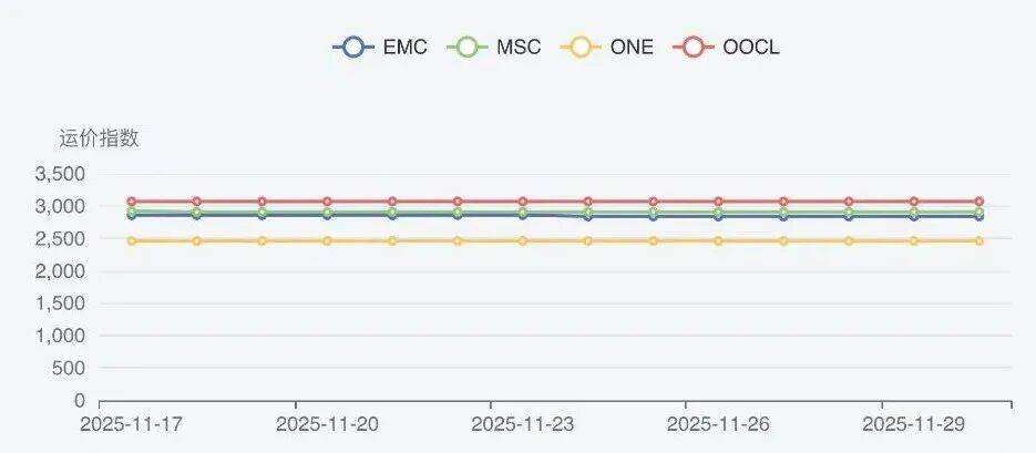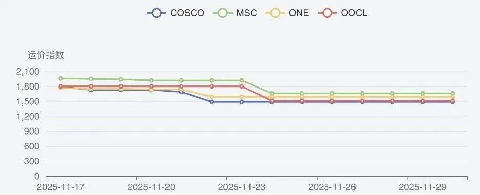 欧洲航线即期市场订舱价格出现回落。11月21日,上海港出口至欧洲基本港市场运价(海运及海运附加费)为1367美元/TEU,较上期下跌3.5%。