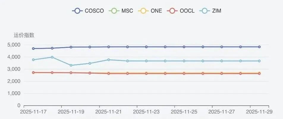 在地中海航线,供求基本面略好于欧洲航线,市场运价小幅上涨。11月21日,上海港出口至地中海基本港市场运价(海运及海运附加费)为2055美元/TEU,较上期上涨1.3%。