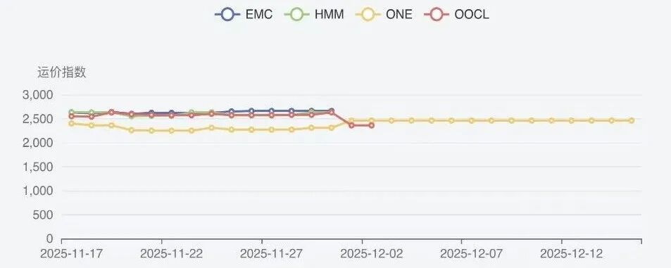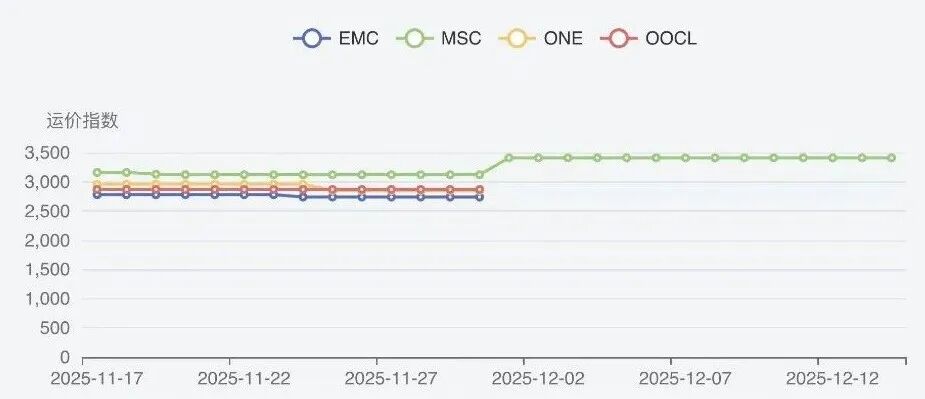 随着船公司签约季的来临,12月上旬运价依旧推涨。但整体市场货量不足,预计月初运价可能小幅下调。目前MSK月初船舱位缩紧,OA单航次特价待更新,MSC舱位充足。