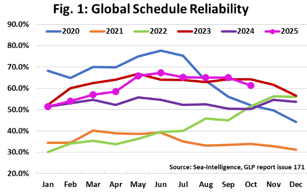 Sea-Intelligence发布了第171期全球班轮绩效(GLP)报告,涵盖2025年10月的船期可靠性,分析了超过60家航运公司和34条贸易航线的性能;以下内容反映了主要发现。