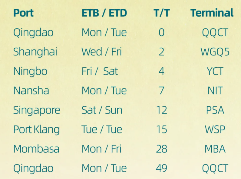MFX航线覆盖青岛、上海、宁波、南沙等中国出口港,船期高效直达东非蒙巴萨。同时,东北亚、东南亚地区的货物亦可通过其近洋航线,中转衔接MFX航线运达蒙巴萨。