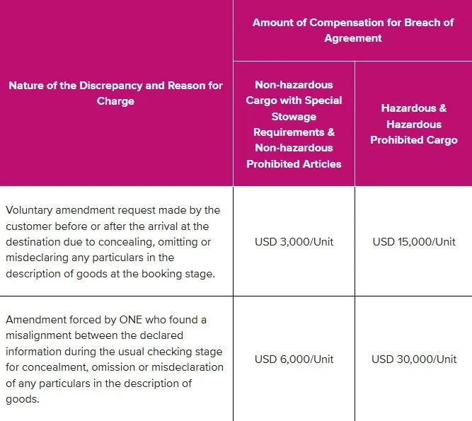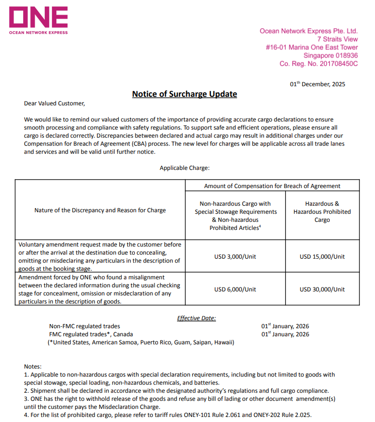 12月1日,ONE发布通知,强调准确如实申报,如申报不符或其他原因隐瞒等,船司将根据相关规定收取费用。