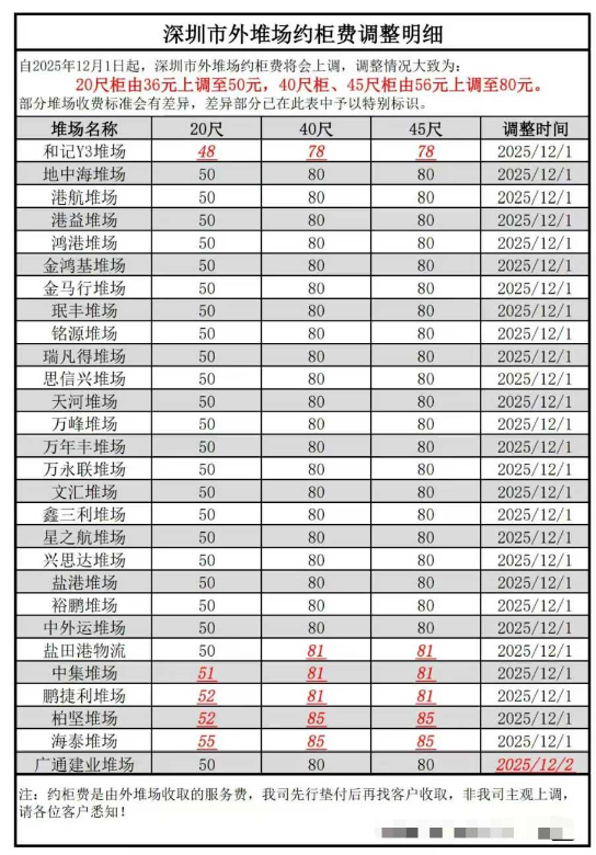10月中旬,深圳多家港口外堆场陆续发布涨价公告,宣布从12月1日起,陆续调整集装箱外堆场“上下车服务费”,即业界俗称的“外堆场约柜费”。