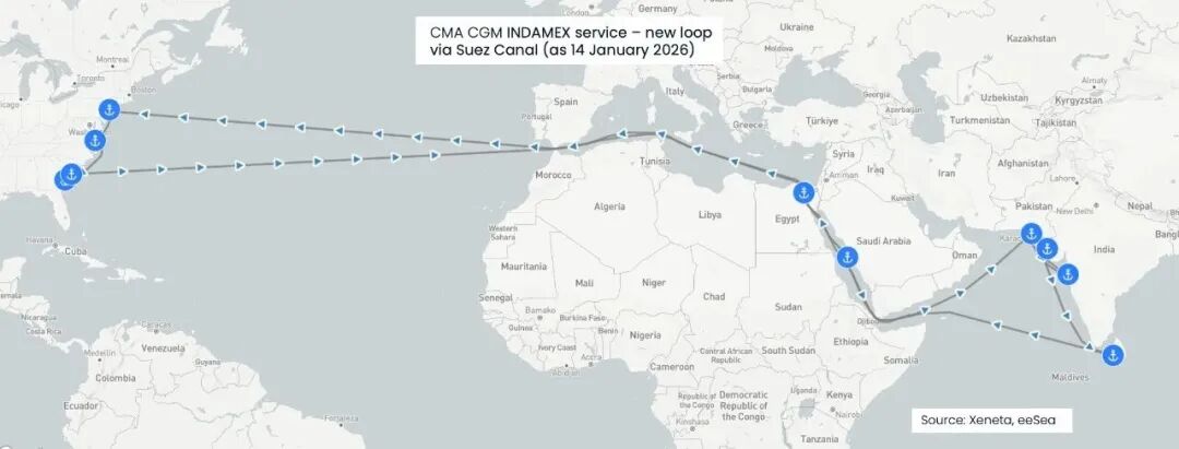 据悉,首艘经由苏伊士运河完成全程航线的船舶确定为“CMA CGM VERDI”号,该船计划于1月15日从卡拉奇启程前往纽约。