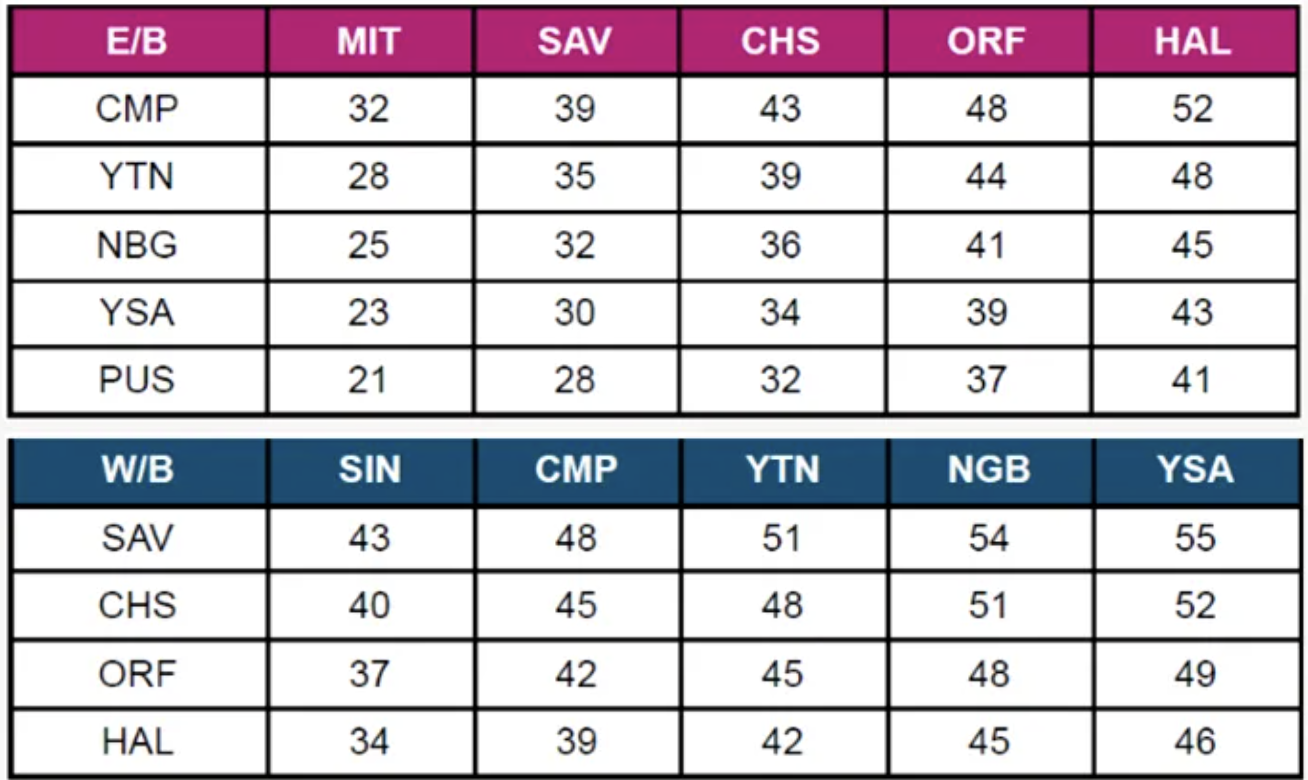 新挂靠港顺序:盖梅港-盐田-宁波-上海-釜山-(巴拿马)-曼萨尼约-萨凡纳-查尔斯顿-诺福克-哈利法克斯-(好望角)-新加坡-(盖梅港)。