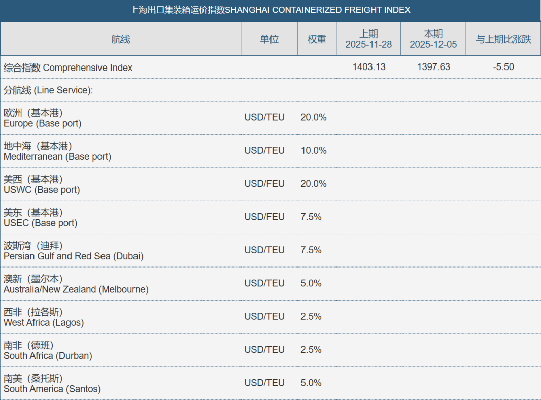 上海航交所12月5日发布的数据中,上周上海出口集装箱运价指数(SCFI)微微下跌至1397.63点,周跌幅0.39%。
