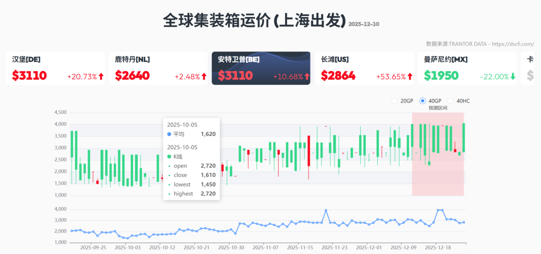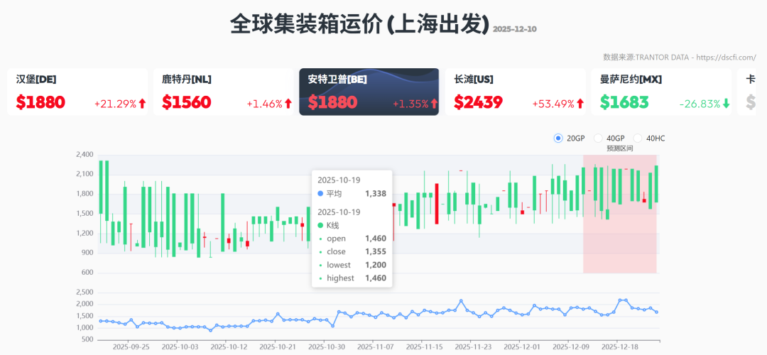 从相关运价数据来看,12月10日,上海出发到安特卫普的集装箱运价分别为20英尺普柜1880美元,40英尺普柜3110美元。