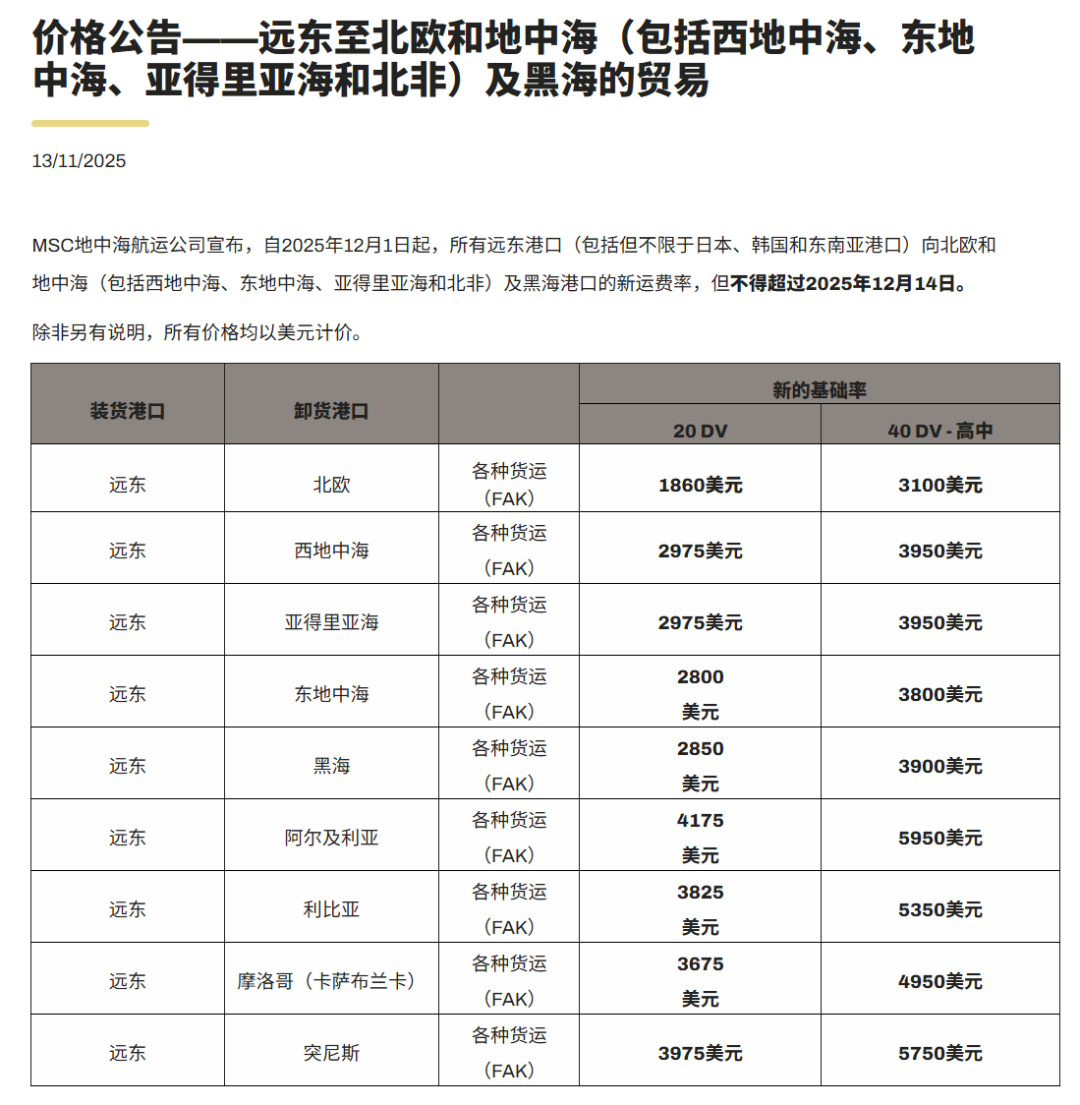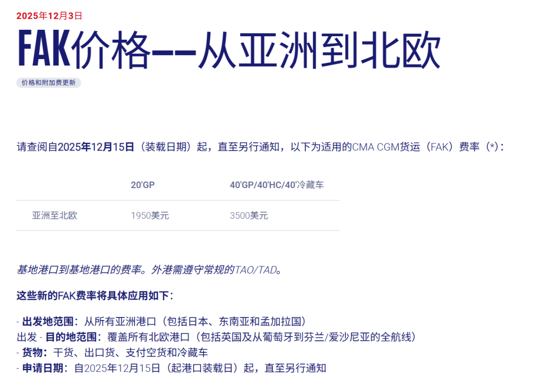 11月29日,又发布新公告:自2025年12月15日起,上调从所有远东港口至北欧、地中海以及黑海港口的FAK(均一费率)运费。