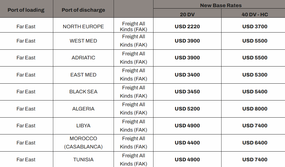 日前,地中海航运宣布,自2026年1月1日起(直至另行通知,但不超过2026年1月14日),从所有远东港口(包括但不限于日本、韩国和东南亚的港口)至北欧及地中海(含西地中海、东地中海、亚得里亚海和北非地区)与黑海港口的以下新运费费率生效。