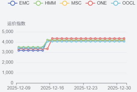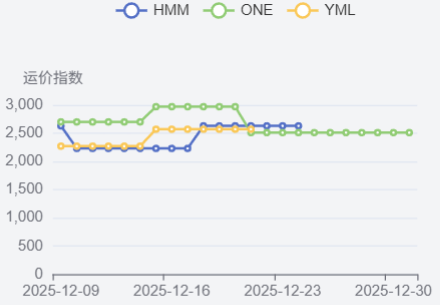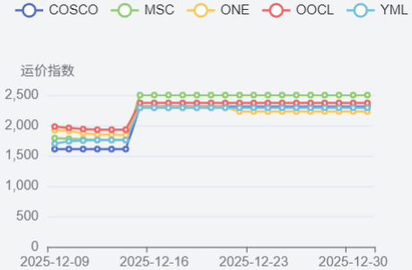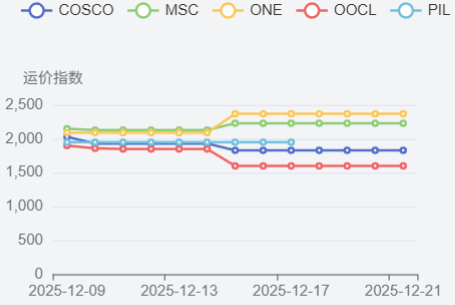 南美航线需求增长乏力,即期市场订舱价格继续下跌。12月12日,上海港出口至南美基本港市场运价(海运及海运附加费)为1486美元/TEU,较上期下跌12.0%。