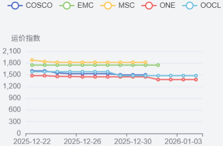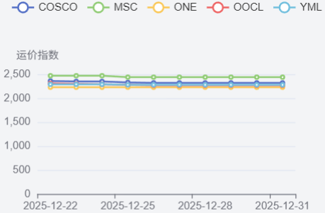 南美航线运输需求总体稳定,供求关系转好,市场运价出现企稳迹象。12月26日,上海港出口至南美基本港市场运价(海运及海运附加费)为1292美元/TEU,较上期微涨0.1%。